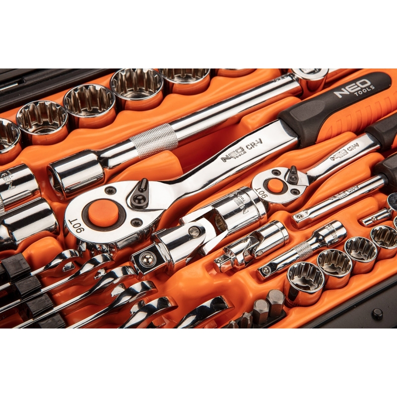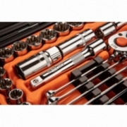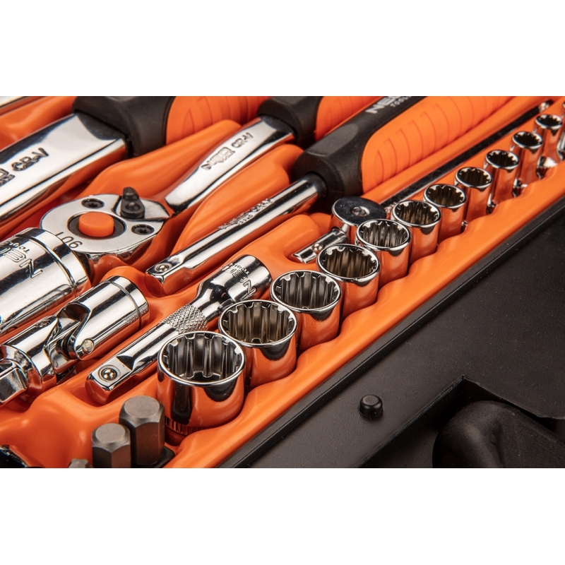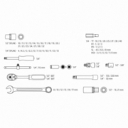 Klucze nasadowe 1/4", 1/2", zestaw 7, 1/4": grzechotka 135 mm, 90 zębów, przełącznik kierunku obrotów, przegub uniwersalny 35 mm, przedłużka 50 mm, adapter do końcówek wkrętakowych, pokrętło z zabierakiem 110 mm, uchwyt wkrętakowy do końcówek 150 mm, 12 szt. nasadek Spline, rozmiary: 4, 4.5, 5, 5.5, 6, 7, 8, 9, 10, 11, 12, 13 mm, 22 szt. końcówek wkrętakowych 25 mm, rozmiary: płaskie 4.5, 6.5, 8 mm, krzyżowe PH1, PH2, PH3, PZ1, PZ2, PZ3, sześciokątne H3, H4, H5, H6, H7, H8, Torx z otworem TT10, TT15, TT20, TT25, TT27, TT30, TT40, 1/2": grzechotka 245 mm, 90 zęby, przełącznik kierunku obrotów, przegub uniwersalny 65 mm, 2 szt. przedłużek 125, 250 mm, redukcja 1/2"M x 3/8"F, pokrętło z zabierakiem 250 mm, 2 szt. nasadek do świec, rozmiary: 16, 21 mm, 18 szt. nasadek Spline, rozmiary: 10, 11, 12, 13, 14, 15, 16, 17, 18, 19, 20, 21, 22, 23, 24, 27, 30, 32 mm, 6 szt. kluczy płasko-oczkowych, rozmiary: 8, 10, 12, 13, 14, 17 mm, stal CrV, końcówki wkrętakowe stal S2, walizka z tworzywa, certyfikat TÜV M+T, 25 lat gwarancji