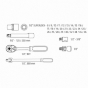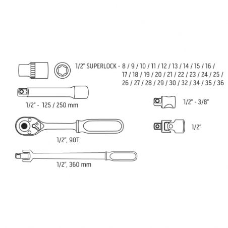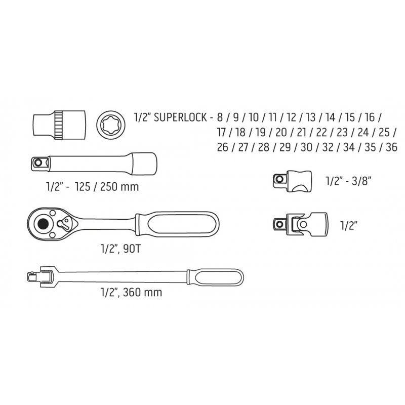 Klucze nasadowe 1/2", zestaw 33 szt., grzechotka 245 mm, 90 zębów, przełącznik kierunku obrotów, rękojeść z przegubem 370 mm, 2 szt. przedłużek 125, 250 mm, przegub uniwersalny 65 mm, redukcja 1/2"M x 3/8"F, 27 szt. nasadek sześciokątnych, rozmiary: 8, 9, 10, 11, 12, 13, 14, 15, 16, 17, 18, 19, 20, 21, 22, 23, 24, 25, 26, 27, 28, 29, 30, 32, 34, 35, 36 mm, stal CrV, walizka z tworzywa, certyfikat TÜV M+T, 25 lat gwarancji