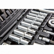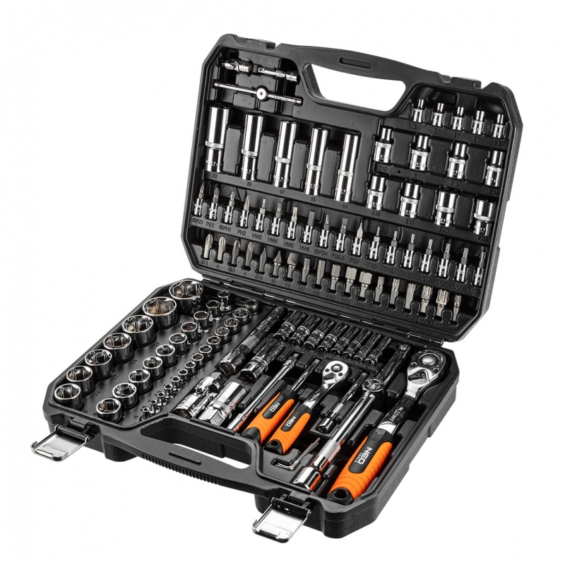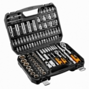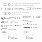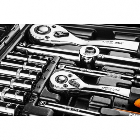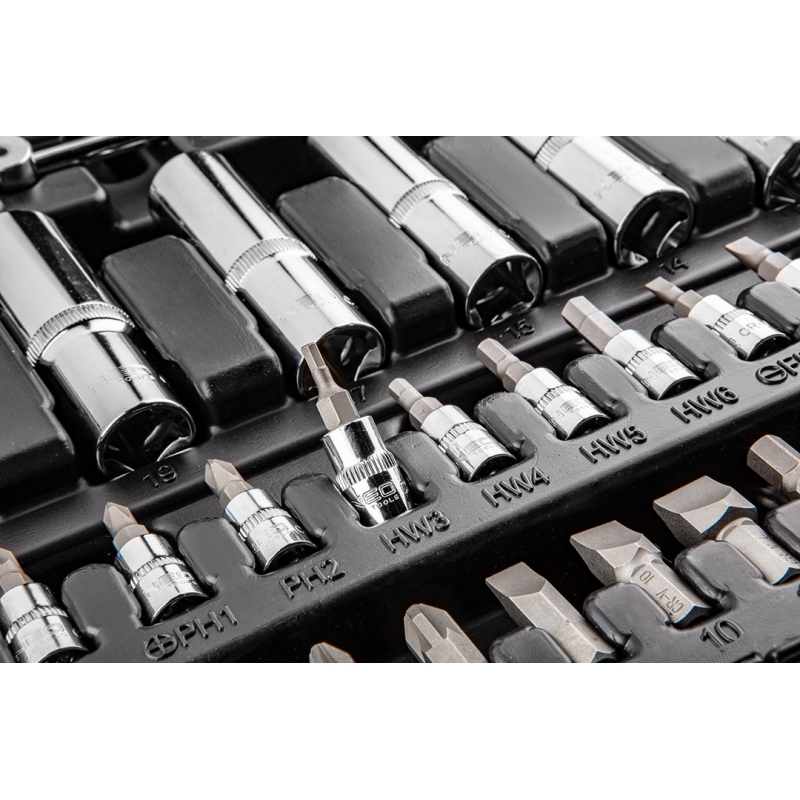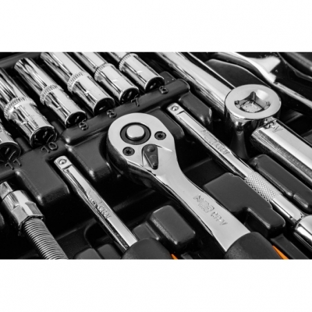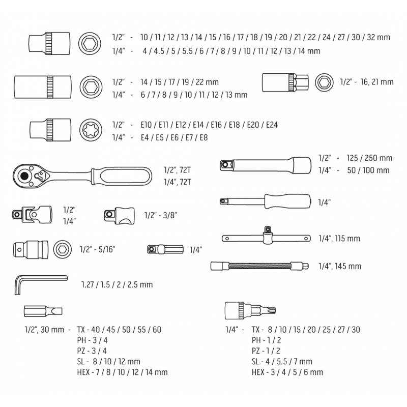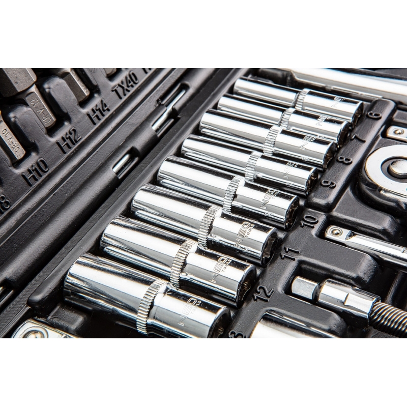 Skład zestawu: rozmiar 1/2": nasadki 17 szt.:10, 11, 12, 13, 14, 15, 16, 17, 18, 19, 20, 21, 22, 24, 27, 30, 32 mm, nasadki długie 5 szt.:14, 15, 17, 19, 22 mm, nasadki E 8 szt.:E10, E11, E12, E14, E16, E18, E20, E24, przegub uniwersalny 1 szt., przedłużki 2 szt.:125 mm, 250 mm, 1 szt. grzechotka, 1 szt. przejściówka 1/2"-3/8" z otworem2 szt., nasadki do świec: 16 mm, 21 mm, 1 szt. przejściówka do bitów, 17 szt. bitów 30 mm: TX - 40, 45, 50, 55, 60, PH: 3, 4, PZ: 3, 4, FD: 8, 10, 12 mm, HEX: 7, 8, 10, 12, 14 mm; rozmiar 1/4": nasadki 13 szt.: 4, 4.5, 5, 5.5, 6, 7, 8, 9, 10, 11, 12, 13, 14 mm, nasadki długie 8 szt.:6, 7, 8, 9, 10, 11, 12, 13 mm, nasadki typu E 5 szt.: E4, E5, E6, E7, E8 przegub uniwersalny 1 szt., przedłużki 2 szt.:50 mm, 100 mm, 1 szt. grzechotka, 1 szt. uchwyt do bitów, 1 szt. pokrętło typu T, 1 szt. przedłużka elastyczna, 1 szt. przejściówka do bitów, 18 szt. bity na nasadce: TX: 8, 10, 15, 20, 25, 27, 30, PH: 1, 2, PZ: 1, 2, FD: 4, 5.5, 7 mm, HEX: 3, 4, 5, 6 mm 4 szt., klucze HEX: 1.27, 1.5, 2, 2.5 mm