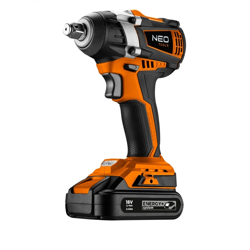 Klucz udarowy akumulatorowy bezszczotkowy NEO Energy+ 18V, 2 x akumulator Energy+ 18V, Li-Ion 2.0Ah, ładowarka do akumulatorów Energy+ 18V, nasadki udarowe do felg aluminiowych, ½”: x 17,19,21 mm, rękojeść teleskopowa z przegubem 1/2" - 330 / 480 mm, przedłużka 125 mm ½”, nasadki sześciokątne 1/2": 10, 11, 12, 13, 14, 15, 16, 17, 18, 19, 20, 21, 22, 24, 27, 30, 32 mm
