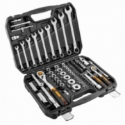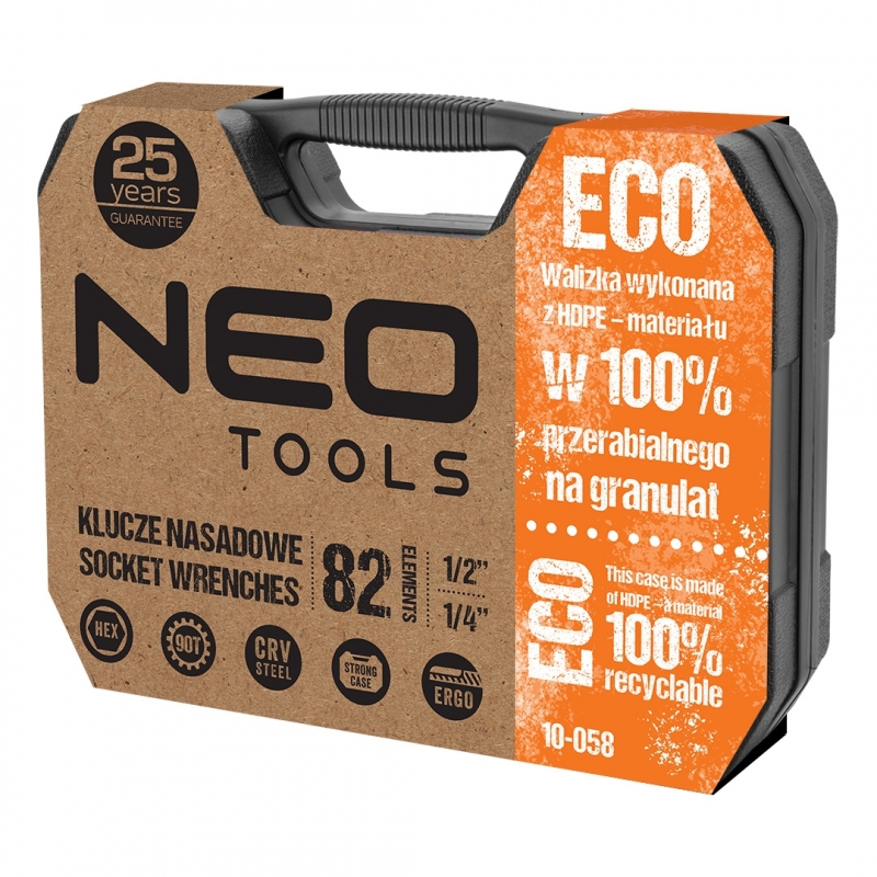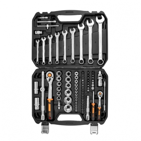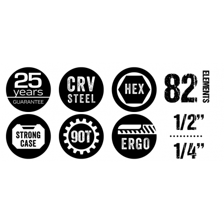 Klucze nasadowe 82 szt., 1/4", 1/2", stal CrV, nasadki sześciokątne 1/2" 12 szt.: 14, 15, 16, 17, 18, 19, 20, 22, 24, 27, 30, 32 mm; grzechotka 1/2", 72 zęby; 1 szt. przegub uniwersalny 1/2"; przedłużka 1/2" 125 mm; pokrętło 250 mm, 1/2" z zabierakiem; 1 szt. adapter z otworem 5/16” x 1/2”; nasadki do świec 1/2" 16 mm, 21 mm; bity 15 szt. T40, T45, T50, T55, FD 8, 10, 12, PH3, PH4, PZ3, PZ4, HEX 8, 10, 12, 14; klucze płaskie 9 szt.: 8, 10, 11, 12, 13, 14, 17, 19, 22 mm; uchwyt 1/4"; nasadki sześciokątne 13 szt.: 4. 4.5, 5, 5.5, 6, 7, 8, 9, 10, 11, 12, 13, 14 mm; 1 szt. pokrętło 1/4" z przesuwanym zabierakiem, 1 szt. elastyczna przedłużka, 1 szt. przegub uniwersalny, 1 szt. grzechotka 1/4", 90 zębów, 2 szt. przedłużka: 50 mm, 100 mm; 17 szt. nasadki 1/4" z bitami: TX8, TX10, TX15, TX20, TX25, TX30, SL4, SL5.5, SL7, PZ1, PZ2, PH1, PH2, HEX3, HEX4, HEX5, HEX6, 25 lat gwarancji. Certyfikat TÜV Rheinland M+T.