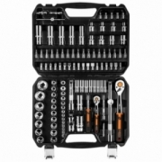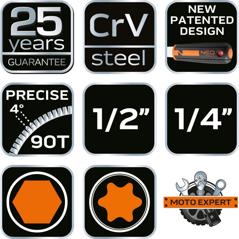Klucze nasadowe 110 szt., 1/4", 1/2", stal CrV, nasadki sześciokątne 1/2" 17 szt.: 10, 11, 12, 13, 14, 15, 16, 17, 18, 19, 20, 21, 22, 24, 27, 30, 32 mm, nasadki długie 1/2" 5 szt.: 14, 15, 17, 19, 22 mm, nasadki Torx 1/2" 8 szt.: E10, E11, E12, E14, E16, E18, E20, E24, grzechotka 1/2", 90 zęby, pokrętło typu T 1/2", przedłużki 1/2" 2 szt.: 125 mm i 250 mm, nasadki do świec 1/2", adapter bitów 5, 16", przegub 1/2", nasadki sześciokątne 1/4" 13 szt.: 4, 4.5, 5, 5.5, 6, 7, 8, 9, 10, 11, 12, 13, 14 mm, nasadki sześciokątne 1/4" 8 szt.: 6, 7, 8, 9, 10, 11, 12, 13 mm, nasadki Torx 1/4" 5 szt.: E4, E5, E6, E7, E8, grzechotka 1/4", 90 zęby, uchwyt do bitów 1/4", pokrętło typu T 1/4", przedłużki 1/4" 2 szt.: 50 mm i 100 mm, przegub 1/4", nasadki 1/4" 18 szt.: TX8, TX10, TX15, TX20, TX25, TX27, TX30, HEX3, HEX4, HEX5, HEX6, PH1, PH2, PZ1, PZ2, SL4, SL5, SL7, bity 5/16" 17 szt.: TX40, TX45, TX50, TX55, TX60, HEX7, HEX8, HEX10, HEX12, HEX14, PH3, PH4, PZ3, PZ4, SL8, SL10, SL12, klucze sześciokątne 4 szt.: 1.3, 1.5, 2, 2.5 mm, 25 lat gwarancji. Certyfikat TÜV Rheinland M+T.