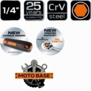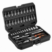 Klucze nasadowe 46 szt., 1/4", stal CrV, nasadki sześciokątne 1/4" 13 szt.: 4, 4.5, 5, 5.5, 6, 7, 8, 9, 10, 11, 12, 13, 14 mm, bity na nasadkach 1/4" 21 szt: SL4, SL5.5, SL7, PH1, PH2, PH3, PZ1, PZ2, PZ3, TX10, TX15, TX20, TX25, TX30, TX40, HEX3, HEX4, HEX5, HEX6, HEX7, HEX8, klucze sześciokątne 4 szt.: 1,27, 1,5, 2, 2,5 mm, przedłużki 1/4" 2 szt.: 50mm, 100 mm, przegub uniwersalny 1/4", przedłużka elastyczna 1/4" 150 mm, pokrętło typu T 1/4", grzechotka 1/4" 90 zębów, 1 szt. wkrętak 1/4", 1 szt adapter, 25 lat gwarancji.
