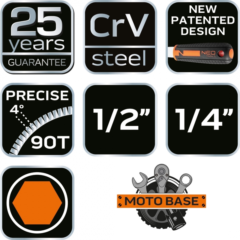Klucze nasadowe 94 szt., 1/4", 1/2" stal CrV, nasadki sześciokątne 1/2" 18 szt.: 10, 11, 12, 13, 14, 15, 16, 17, 18, 19, 20, 21, 22, 23, 24, 27, 30, 32 mm, nasadki długie sześciokątne 1/2" 4 szt.: 14, 15, 17, 19 mm, grzechotka 1/2", 90 zęby, przedłużka 1/2" 2 szt.: 125 mm i 250 mm, nasadki do świec 1/2" 2 szt.: 16 mm i 21 mm, adapter do bitów 1/2" - 5/16", adapter 1/2", przegub uniwersalny 1/2", nasadki sześciokątne 1/4" 13 szt.: 4, 4.5, 5, 5.5, 6, 7, 8, 9, 10, 11, 12, 13, 14 mm, nasadki długie sześciokątne 1/4" 8 szt.: 6, 7, 8, 9, 10, 11, 12, 13 mm, grzechotka 1/4" 90 zęby, pokrętło 1/4", przegub uniwersalny 1/4", przedłużki 1/4" 2 szt.: 50mm i 100mm, wkrętak do bitów 1/4", przedłużka elastyczna 1/4" 150 mm, adapter 30 mm, bity na nasadkach 1/4" 17 szt.: TX8, TX10, TX15, TX20, TX25, TX30, HEX3, HEX4, HEX5, HEX6, PH1, PH2, PZ1, PZ2, SL4, SL5.5, SL7, bity 5/16" 15 szt.: TX40, TX45, TX50, TX55 HEX8, HEX10, HEX12, HEX14, PH3, PH4, PZ3, PZ4, SL8, SL10, SL12, klucze sześciokątne 3 szt.: 1.5, 2, 2.5 mm, 25 lat gwarancji.