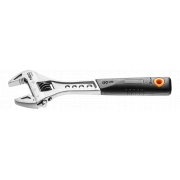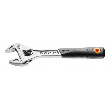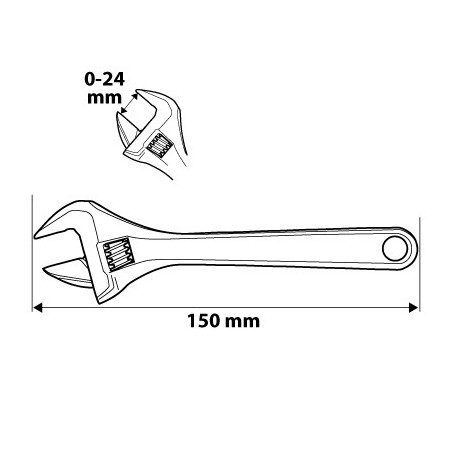 Klucz nastawny 150 mm, zakres 0-24 mm, odkuwany, podziałka metryczna, odchylenie główki 22°, zaznaczony optymalny kierunek pracy, stal CrV, DIN3117, uchwyt pokryty tworzywem odpornym na działanie smarów i olejów, certyfikat TÜV M+T, 25 lat gwarancji