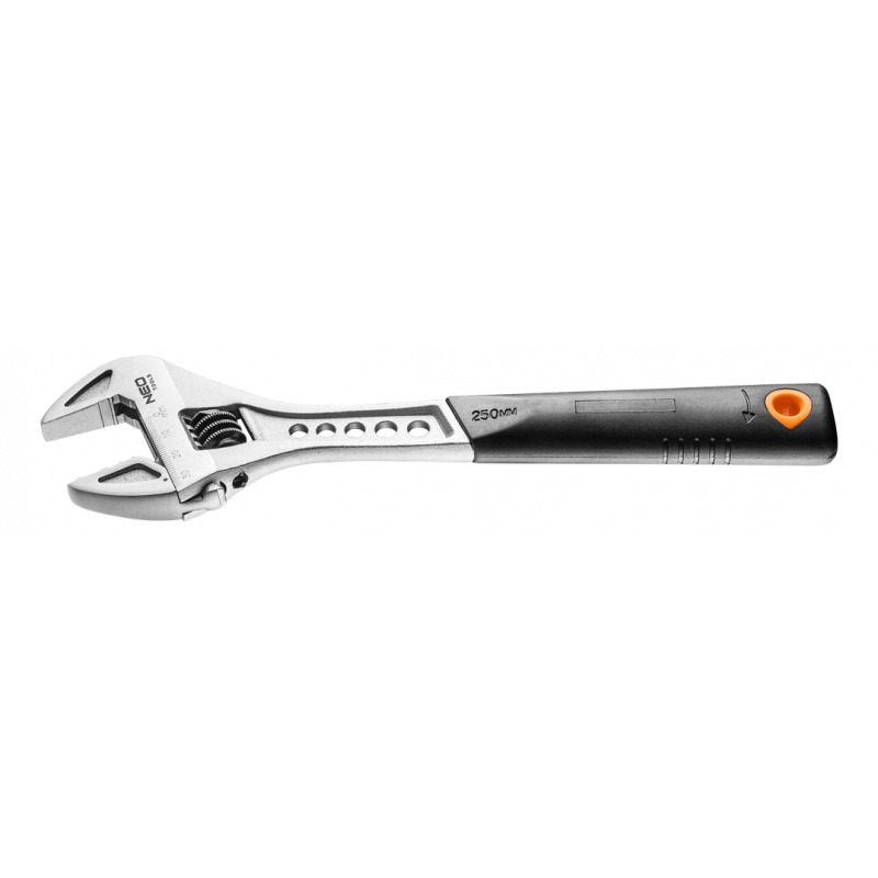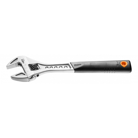 Klucz nastawny 250 mm, zakres 0-33 mm, odkuwany, podziałka metryczna, odchylenie główki 22°, zaznaczony optymalny kierunek pracy, stal CrV, DIN3117, uchwyt pokryty tworzywem odpornym na działanie smarów i olejów, certyfikat TÜV M+T, 25 lat gwarancji