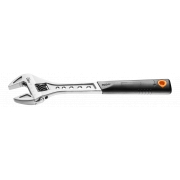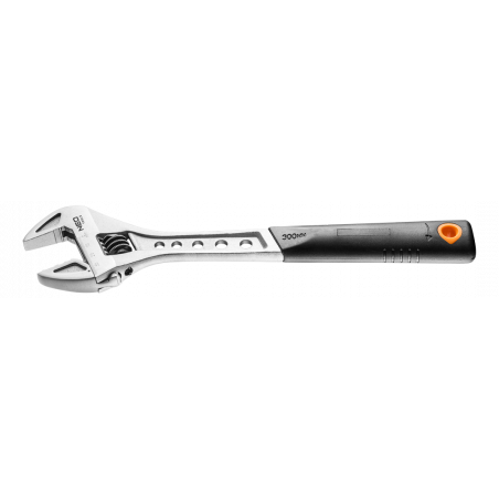 Klucz nastawny 300 mm, zakres 0-38 mm, odkuwany, podziałka metryczna, odchylenie główki 22°, zaznaczony optymalny kierunek pracy, stal CrV, DIN3117, uchwyt pokryty tworzywem odpornym na działanie smarów i olejów, certyfikat TÜV M+T, 25 lat gwarancji