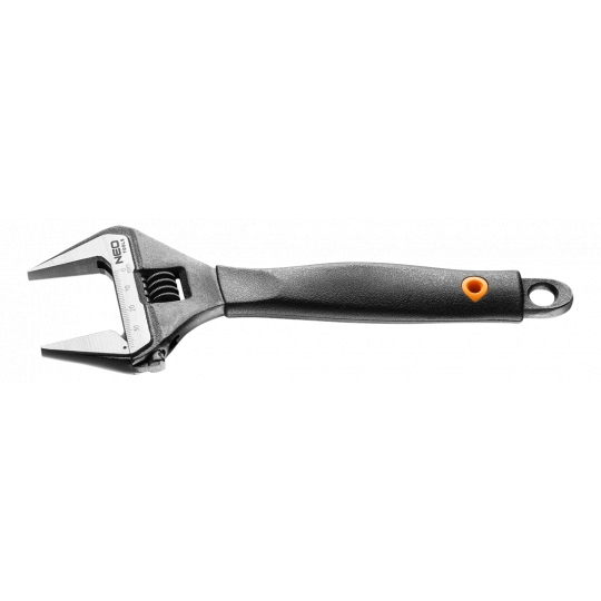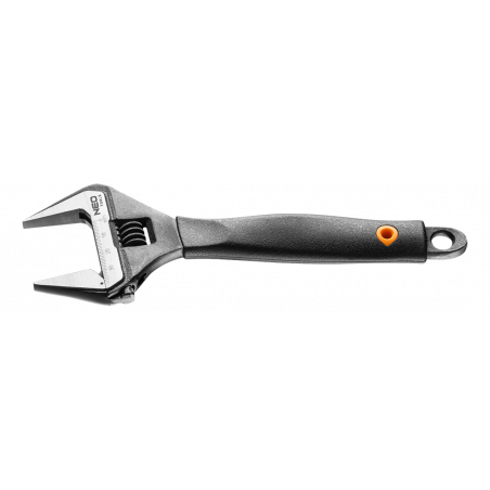 Klucz nastawny 200 mm, zakres 0-39 mm, rozstaw szczęk 40% większy od standardowego klucza 200 mm, poszerzona i pocieniona głowica, odkuwany, podziałka metryczna, odchylenie główki 22°, stal CrV, DIN3117, uchwyt pokryty tworzywem odpornym na działanie smarów i olejów, certyfikat TÜV M+T, 25 lat gwarancji