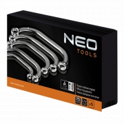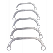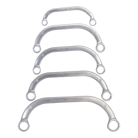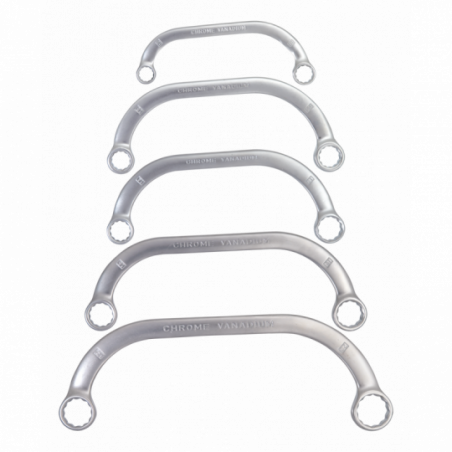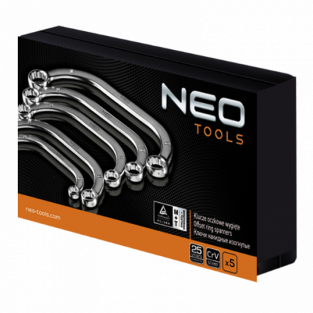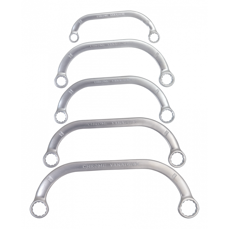 Klucze oczkowe wygięte 9-22 mm, zestaw 5 szt., odkuwane, wzmocnione, chwyt łukowy, odporny na wygięcia, stal CrV, rozmiary 9 x 12 mm, 13 x 15 mm, 14 x 17 mm, 16 x 18 mm, 19 x 22 mm, DIN7444, certyfikat TÜV M+T, 25 lat gwarancji