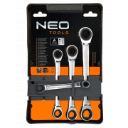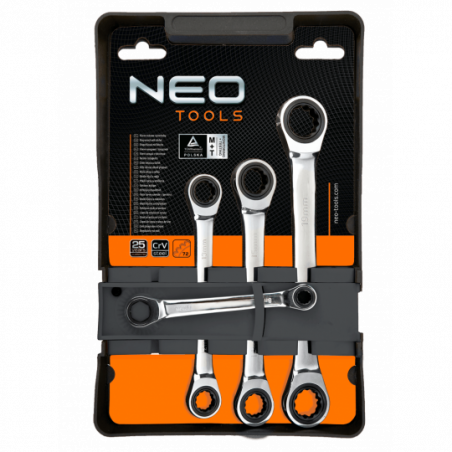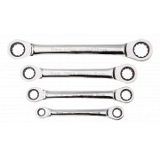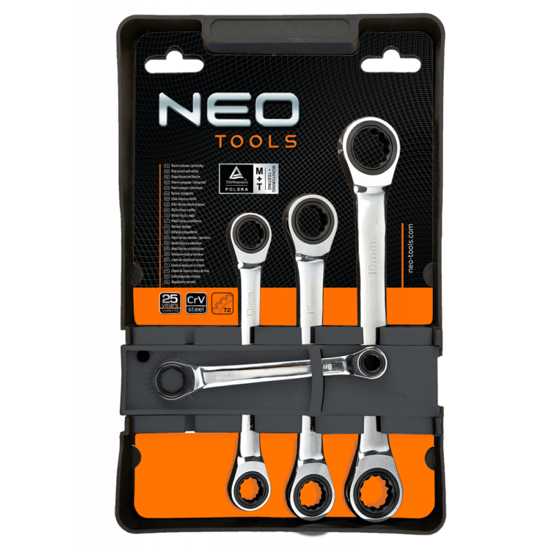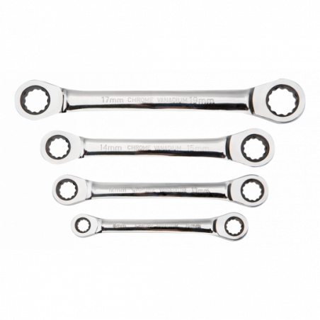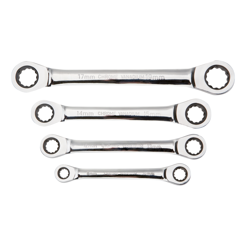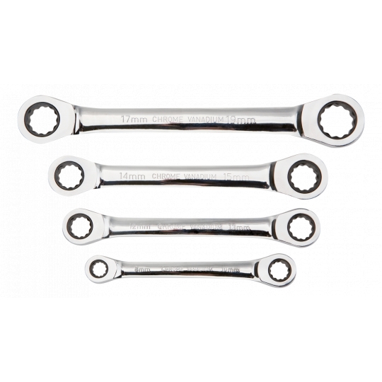 Klucze oczkowe z grzechotką 8-19 mm, zestaw 4 szt., mechanizm zapadkowy 72 zęby, stal CrV, rozmiary: 8 x 10 mm, 12 x 13 mm, 14 x 15 mm, 17 x 19 mm, certyfikat TÜV M+T, 25 lat gwarancji