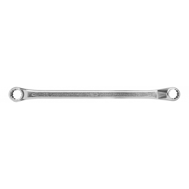 Klucz oczkowy odgięty 10 x 11 mm, stal CrV, DIN838, przetłoczenie, wykończenie satynowe, certyfikat TÜV M+T, 25 lat gwarancji