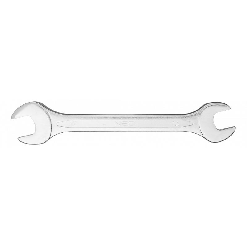 Klucz płaski dwustronny 16 x 17 mm, stal CrV, DIN3110, przetłoczenie, wykończenie satynowe, polerowana główka, certyfikat TÜV M+T, 25 lat gwarancji