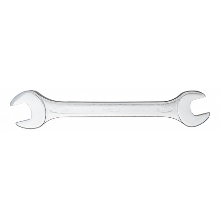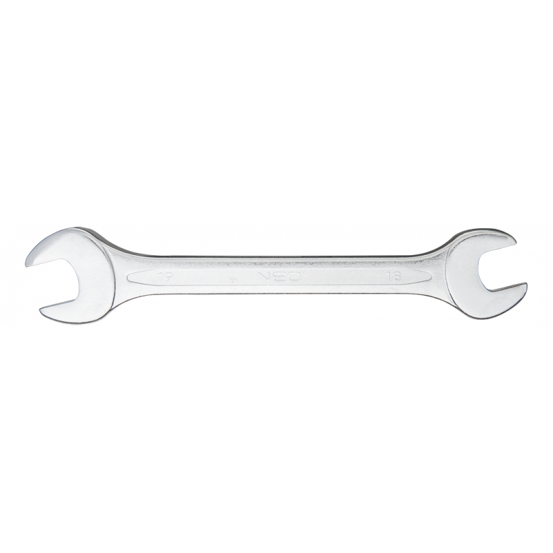 Klucz płaski dwustronny 18 x 19 mm, stal CrV, DIN3110, przetłoczenie, wykończenie satynowe, polerowana główka, certyfikat TÜV M+T, 25 lat gwarancji