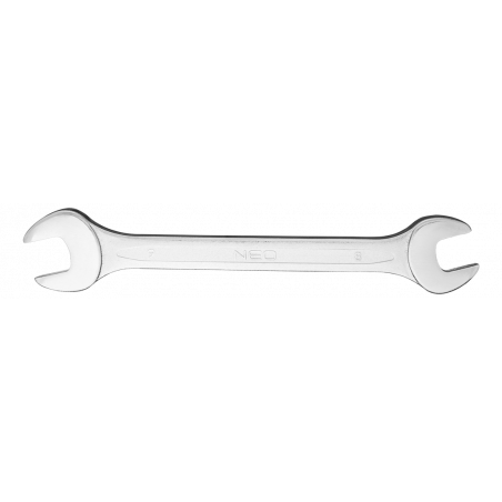 Klucz płaski dwustronny 8 x 9 mm, stal CrV, DIN3110, przetłoczenie, wykończenie satynowe, polerowana główka, certyfikat TÜV M+T, 25 lat gwarancji
