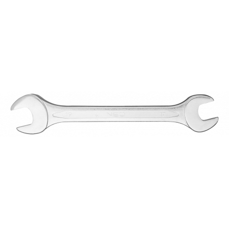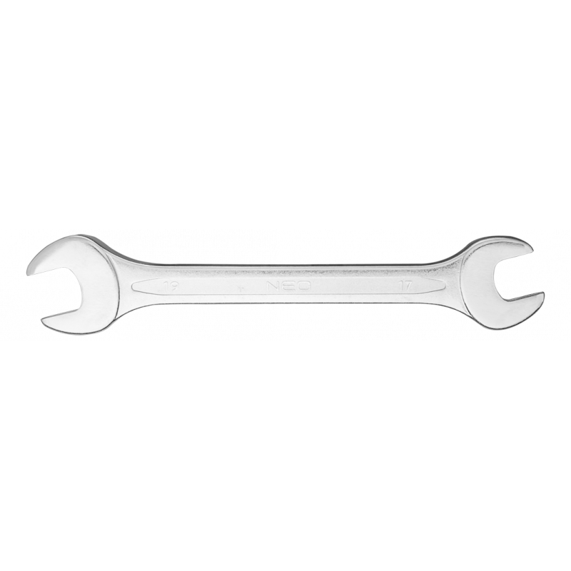 Klucz płaski dwustronny 17 x 19 mm, stal CrV, DIN3110, przetłoczenie, wykończenie satynowe, polerowana główka, certyfikat TÜV M+T, 25 lat gwarancji