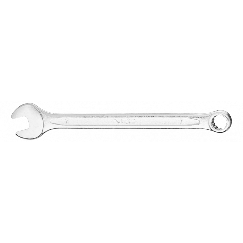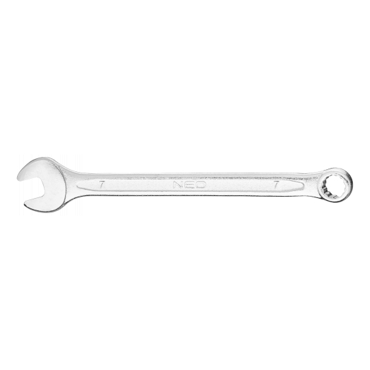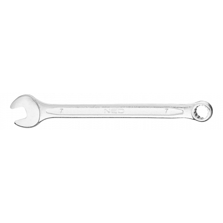 Klucz płasko-oczkowy 7 x 110 mm, stal CrV, DIN3113, przetłoczenie, wykończenie satynowe, polerowana główka odgięta pod kątem 15°, certyfikat TÜV M+T, 25 lat gwarancji