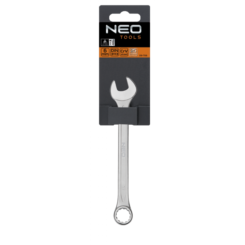 Klucz płasko-oczkowy 19 x 230 mm, stal CrV, DIN3113, przetłoczenie, wykończenie satynowe, polerowana główka odgięta pod kątem 15°, certyfikat TÜV M+T, 25 lat gwarancji