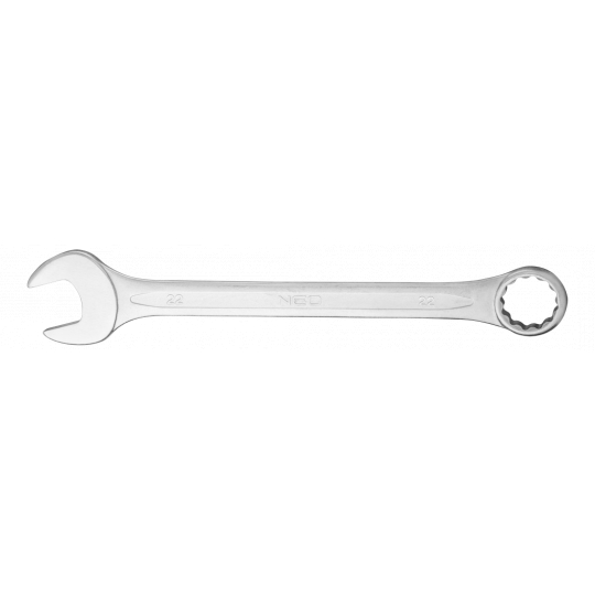 Klucz płasko-oczkowy 22 x 260 mm, stal CrV, DIN3113, przetłoczenie, wykończenie satynowe, polerowana główka odgięta pod kątem 15°, certyfikat TÜV M+T, 25 lat gwarancji