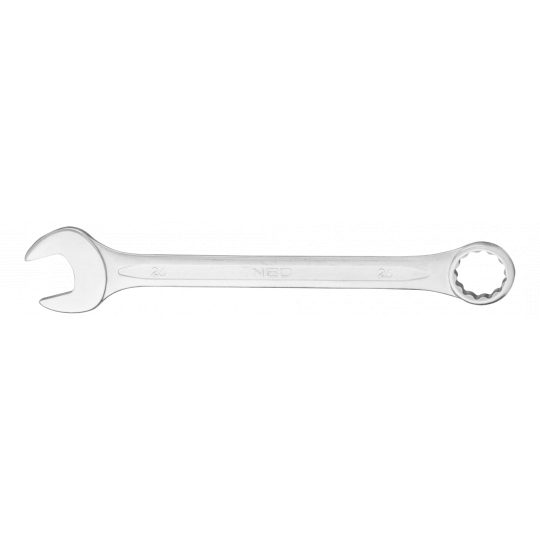 Klucz płasko-oczkowy 26 x 295 mm, stal CrV, DIN3113, przetłoczenie, wykończenie satynowe, polerowana główka odgięta pod kątem 15°, certyfikat TÜV M+T, 25 lat gwarancji