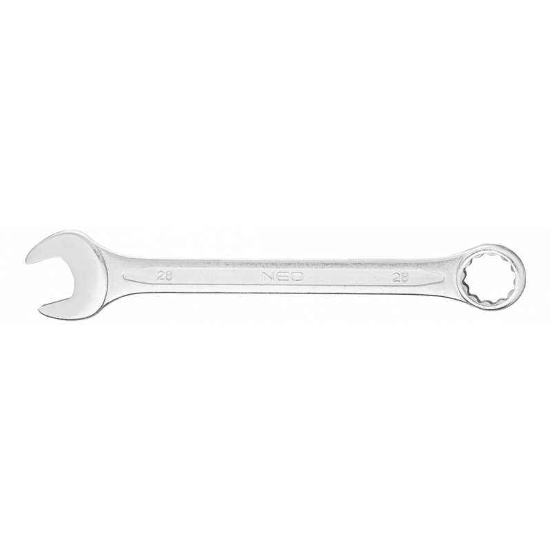Klucz płasko-oczkowy 28 x 310 mm, stal CrV, DIN3113, przetłoczenie, wykończenie satynowe, polerowana główka odgięta pod kątem 15°, certyfikat TÜV M+T, 25 lat gwarancji