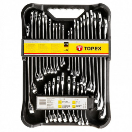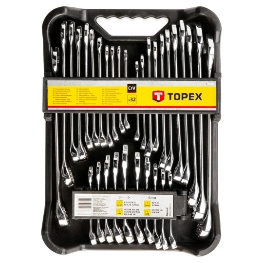 Klucze płasko-oczkowe zestaw 32 szt., rozmiary krótkie: 10, 11, 12, 13, 14 mm, 3/8", 7/16", 1/2", 5/8", rozmiary długie: 6, 7, 8, 9, 10, 11, 12, 13, 14, 17, 19 mm, 1/4", 5/16", 3/8", 7/16", 1/2", 9/16", 5/8", 11/16", 3/4", 13/16", 7/8"