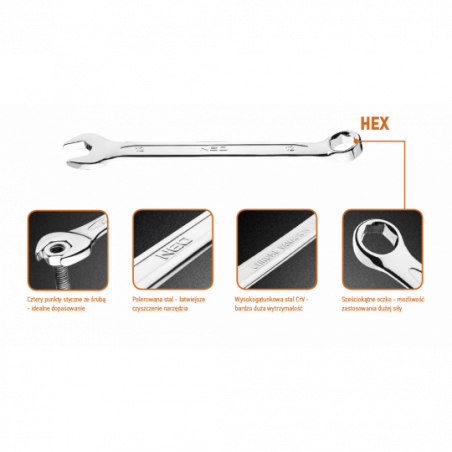 Klucz płasko-oczkowy 11 mm, oczko sześciokątne, profilowana część otwarta klucza, stal CrV, zgodny z normą DIN 3113, 25 lat gwarancji