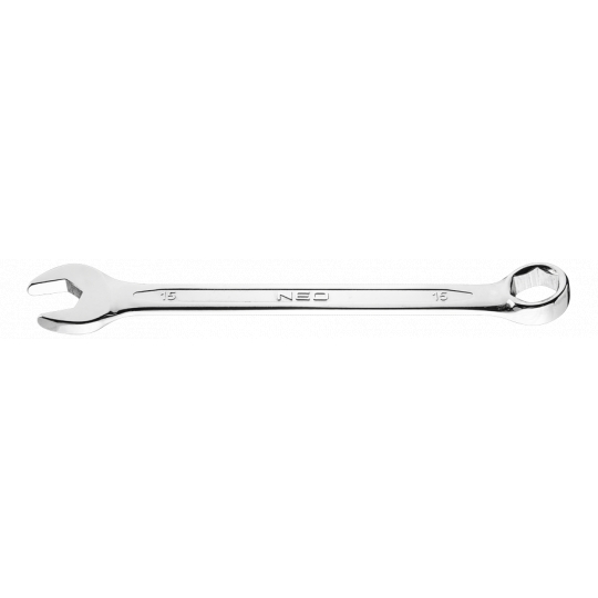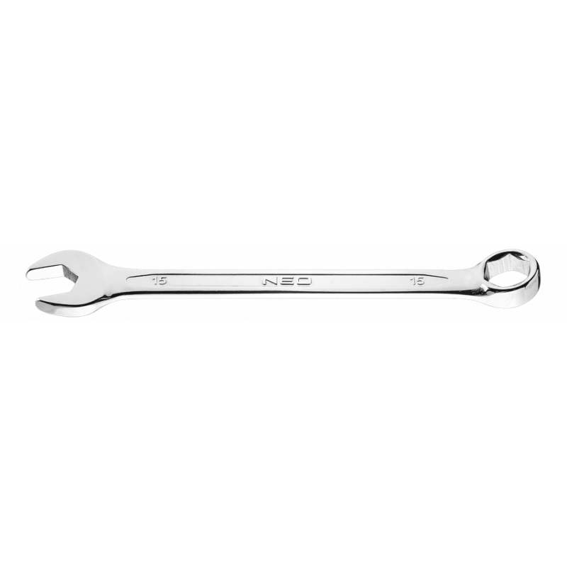 Klucz płasko-oczkowy 15 mm, oczko sześciokątne, profilowana część otwarta klucza, stal CrV, zgodny z normą DIN 3113, 25 lat gwarancji