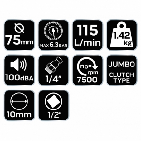 Klucz udarowy kątowy, 1/2", 500 Nm, ciśnienie robocze 6.3 bar, średnie zużycie powietrza 113 l/min., 75000 obr.-1, waga 1.17 kg, CE