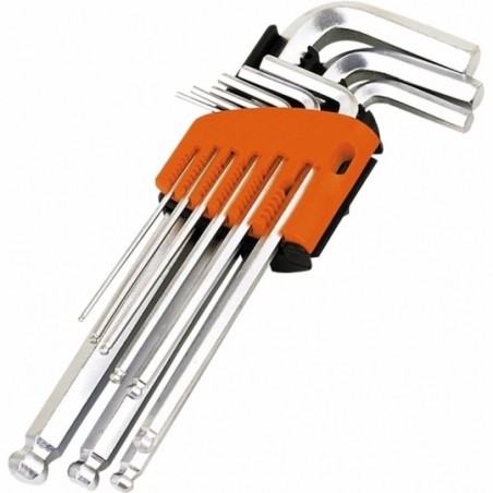 Zestaw kluczy imbusowych średniej długości. Zastosowano stal CR-V. Polerowane. Zestaw zawiera kuliste i sześciokątne końcówki (9 szt.): 1.5 mm, 2 mm, 2.5 mm, 3 mm, 4 mm, 5 mm, 6 mm, 8 mm, 10 mm.