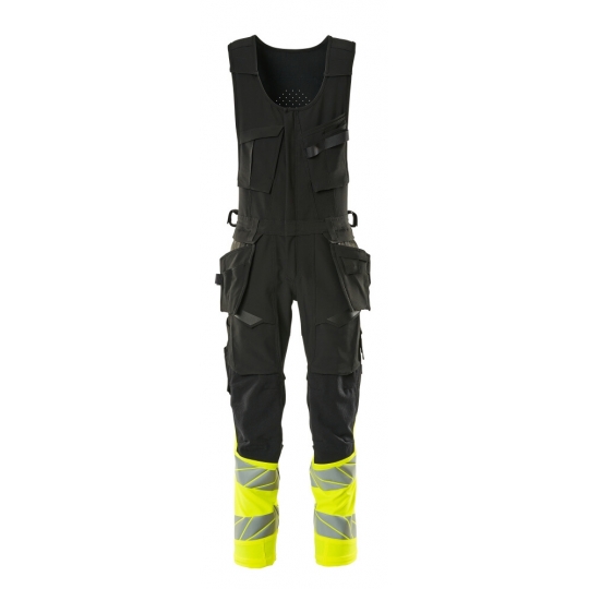 Materiał streczowy rozciąga się we wszystkich kierunkach, co zapewnia użytkownikowi niezrównaną swobodę ruchu, bez ucisku i ocierania.; Wielofunkcyjny materiał streczowy łączy niską wagę z bardzo dużą trwałością. Jest przy tym wodoodporny.; Kieszenie wiszące ze wzmocnieniem z tkaniny Kevlar® i CORDURA®.; Odpinane kieszenie wiszące.; Kieszeń na calówkę posiada wzmocnienia z Kevlar®-szczególna odporność na działanie spiczastych i ostrych przedmiotów.; Skuteczna wentylacja nóg dzięki zamkowi błyskawicznemu w tylnej części uda.; Kieszenie na wkładki kolanowe, wykonane z rozciągliwego w dwóch kierunkach materiału CORDURA® i zapewniające dodatkową swobodę ruchu podczas pracy na kolanach.; Regulowane kieszenie na kolanach umożliwiają odpowiednie umieszczenie nakolanników.; Certyfikowane do użytku z wkładkami ochronnymi MASCOT typu SHORT lub LONG (wysokość kieszeni na kolanach jest regulowana).