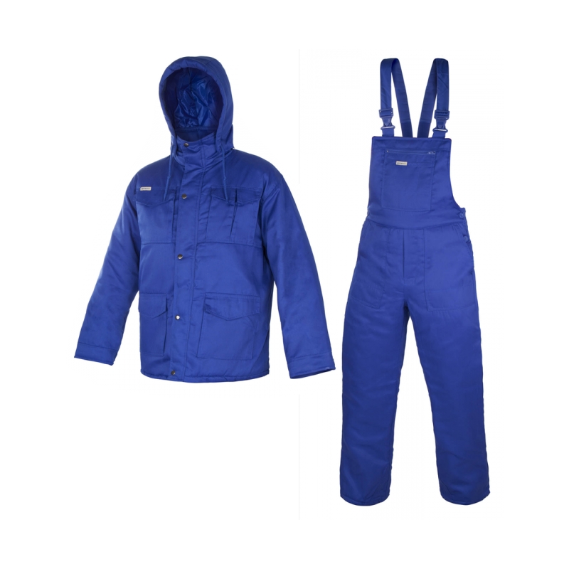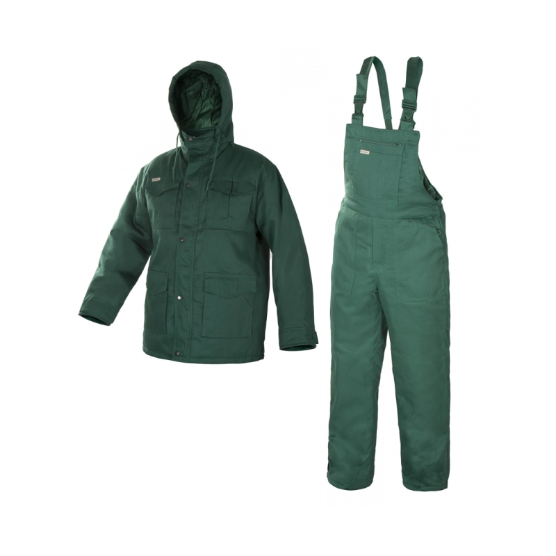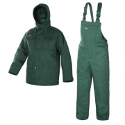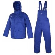Ocieplane ubranie ochronne: bluza 3/4 + spodnie ogrodniczki, wykonane z wytrzymałej tkaniny (skład 65% poliestru i 35% bawełny) o gramaturze 200-210+/-10 g/m2 oraz mocnym zwartym splocie, poliestrowej ociepliny, od wewnątrz wykończone poliestrową pikowaną podszewką.