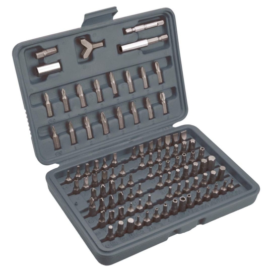 Końcówki wkrętakowe z uchwytem, 1/4", zestaw 100 szt., CrV, długość nasadek i bitów 25 mm, rozmiary końcówek wkrętakowych: płaskie 3, 4, 4.5, 5, 5.5, 6, 6.5, 7, 8, PH 0, 1, 2, 3, PZ 0, 1, 2, 3, Torx 8, 10, 15, 20, 25, 27, 30, 40, 45, Torx z dziurką 8, 10, 15, 20, 25, 27, 30, 40, 45, Hex 1.5, 2, 2.5, 3, 4, 5, 5.5, 6, 8, 1/16", 5/64", 3/32", 7/64", 1/8", 9/64", 5/32", 3/16", 7/32", 1/4", HEX z dziurką 2, 2.5, 3, 4, 5, 6, 5/64", 3/32", 7/64", 1/8", 9/64", 5/32", trzyskrzydłowe 1, 2, 3, 4, czteroskrzydłowe 6, 8, 10, końcówka serwisowa 4, 6, 8, 10, Spline 5, 6, 8, końcówka kwadratowa 0, 1, 2, 3, dwuskrzydłowa 1, 2, 3.