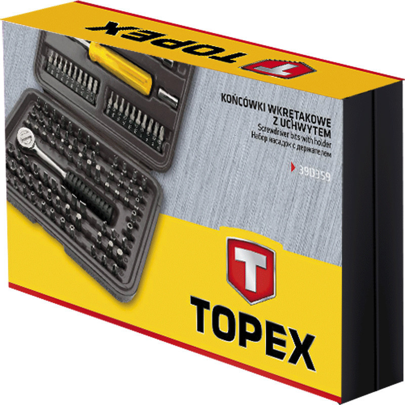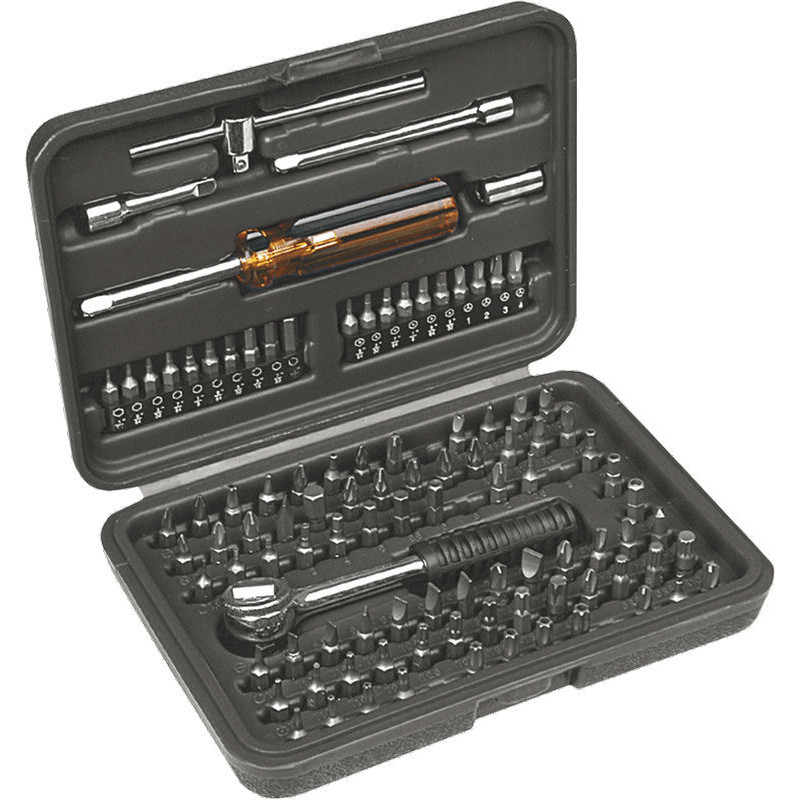 Końcówki wkrętakowe z uchwytem, zestaw 101 cz., 1/4", grzechotka 48 zębów, 130 mm, uchwyt wkrętakowy 150 mm, pokrętło z kwadratem zabierającym 110 mm, 2 szt. przedłużek, rozmiary 50, 100 mm, adapter, 95 szt. końcówek wkrętakowych 25 mm, stal CrV, rozmiary: płaskie 3, 4, 4.5, 5, 5.5, 6, 6.5, 7, 8 mm, krzyżowe PH0, PH1, 5 x PH2, PH3, PZ0, PZ1, 5 x PZ2, PZ3, Torx T8, T10, T15, T20, T25, T27, T30, T40, T45, Torx z otworem TT8, TT10, TT15, TT20, TT25, TT27, TT30, TT35, TT40, sześciokątne H1.5, H2, H2.5, H3, H4, H5, H5.5, H6, H8, sześciokątne z otworem H2, H2.5, H3, H4, H5, H6, sześciokątne calowe H1, 16, H5, 64, H3, 32, H7, 64, H1, 8, H9, 64, H5, 32, H3, 16, H7, 32, H1, 4, sześciokątne z otworem calowe H5, 64, H3, 32, H7, 64, H1, 8, H9, 64, H5, 32, Spline M5, M6, M8, kwadrat No0, No1, No2, No3, serwisowe 4, 6, 8, 10 mm, trzyskrzydłowe 1, 2, 3, 4 mm, dwuskrzydłowe 1, 2, 3 mm, czteroskrzydłowe 6, 8, 10 mm, etui z tworzywa