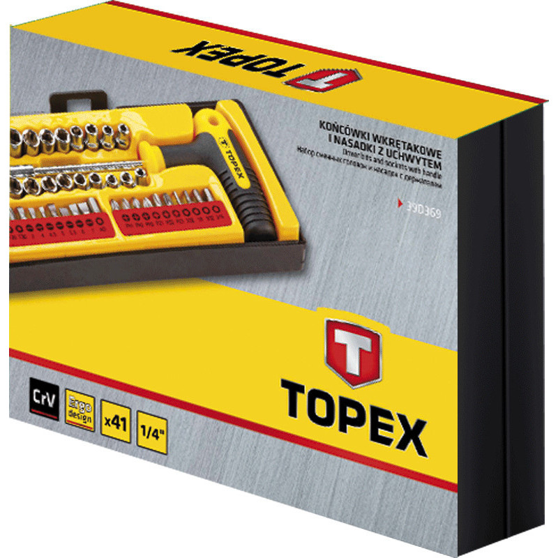 Końcówki wkrętakowe i nasadki z uchwytem, zestaw 4, 1/4", uchwyt wkrętakowy typu T, 9 szt. nasadek sześciokątnych metrycznych, rozmiary: 4, 4.5, 5, 5.5, 6, 7, 8, 9, 10 mm, 9 szt. nasadek sześciokątnych metrycznych, rozmiary: 5, 32", 3, 16", 7, 32", 1/4", 9, 32", 5, 16", 11, 32", 3/8", 13, 32", 19 szt. końcówek wkrętakowych, rozmiary: płaskie 3, 4, 4.5, 5, 5.5, 6, 7 mm, krzyżowe PH1, PH2, PH3, PZ1, PZ2, PZ3, Torx T20, T30, sześciokątne calowe H3, 32, H1, 8, H5, 32, H3, 16, adapter do końcówek wkrętakowych, adapter do nasadek, adapter do nasadek wygiety, stal CrV, końcówki wkrętakowe ze stali S2, walizka z etui