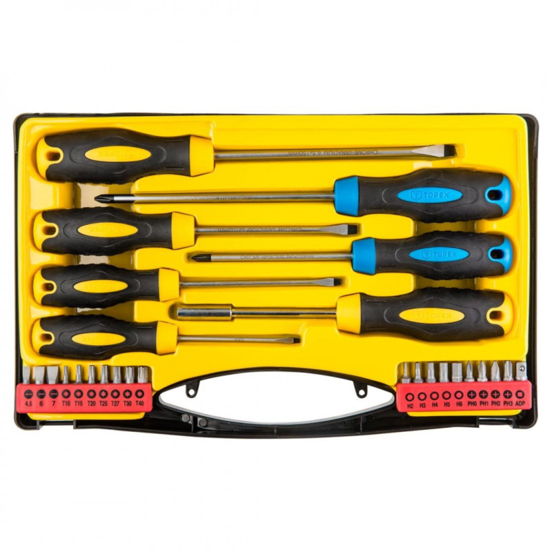 Wkrętaki i końcówki wkrętakowe, zestaw 27 szt., hartowana końcówka, magnetyczna końcówka, stal CrV, dwumateriałowy uchwyt, 6 szt. wkrętaków, rozmiary: 3.2 x 75 mm, 4 x 100 mm, 5 x 100 mm, 6.5 x 150 mm, PH1 x 100 mm, PH2 x 150 mm, uchwyt wkrętakowy do końcówek wkrętakowych, 19 szt. końcówek wkrętakowych, rozmiary: płaskie 4.5 mm, 6 mm, 7 mm, krzyżowe PH0, PH1, PH2, PH3, Torx T10, T15, T20, T25, T27, T30, T40, sześciokątne H2, H3, H4, H5, H6, adapter do nasadek, walizka