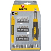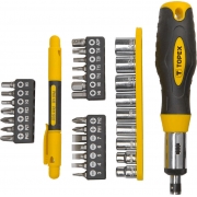 Końcówki wkrętakowe z uchwytem, dwumateriałowy uchwyt z grzechotką z blokadą lewo, prawo, końcówki: płaskie 3, 4, 5, 6, 7 mm, PH1, PH2, PH3, PZ1, PZ2, PZ3, T10, T15, T20, T30, H3, H4, H5, H6, H8, przejściówka kwadrat 1/4", sześciokąt, nasadki sześciokątne: 5, 6, 7, 8, 9, 10, 11, 12, 13 mm, uchwyt długopisowy z końcówkami PH1 x 5, 32" i PH0 x 1, 8"