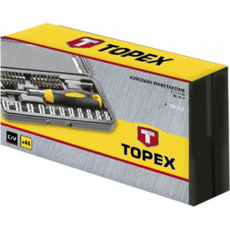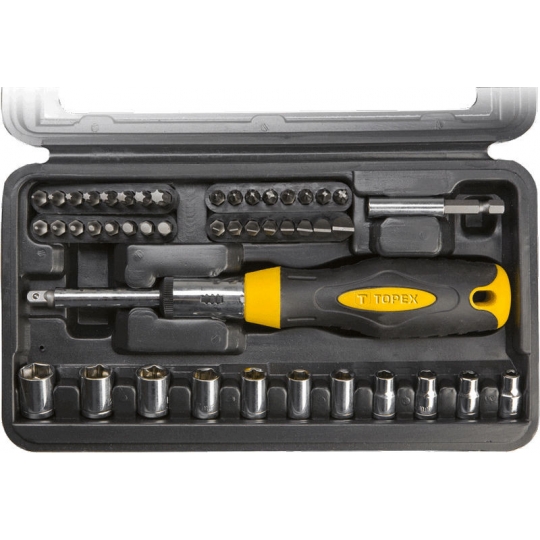 Końcówki wkrętakowe z uchwytem, dwumateriałowy uchwyt z grzechotką z blokadą lewo, prawo, końcówki: płaskie 3, 4, 4.5, 5, 6, 7, 8, 9 mm, PH0, PH1, PH2, PH3, PZ0, PZ1, PZ2, PZ3, STAR: 15, 20, 35, H1.5, H2, H2.5, H3, H4, H5, H5.5, H6, T5 T10, T15, T20, T25, T27, T30, T40, przejściówka kwadrat 1/4", sześciokąt, nasadki sześciokątne: 4, 5, 5.5, 6, 7, 8, 9, 10, 11, 12, 13 mm, plastikowe etui