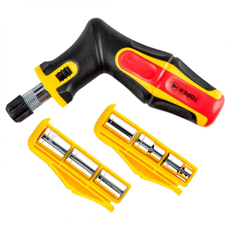 Zestaw końcówek wkrętakowych i nasadek z uchwytem 15 szt. (nr ref. 39D893) (LxWxH) 220 x 145 x 36 mm. Stal CRV, 51-54HRC, grzechotka, 3 magazynki, długość końcówek 25mm, rozmiary płaskie 5, 6 mm, krzyżówej PH1, PH2, PH3, Torx T10, T20, nasadki 1/4, rozmiary 5, 6, 7, 8, 9, 10, 11, uchwyt nasadek