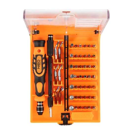 Końcówki wkrętakowe precyzyjne z uchwytem 53 szt. (nr ref 06-111) uchwyt, przełużka elastyczna, przedłużka sztywna, stal Crv, HRC 50-53, klucze płaskie:M4.0 M4.5 M5.0 M5.5 M6.0 M7.0, nasadki M2.5 M3.0 M3.5 M4.0 M4.5 M5.0 M 5.5 Torxy:T3/T4/T5/T6/T7/T8/T9/T10/T15/T20, Hex: H0.9/H1.3/H1.5/H2.0/H2.5/H3.0/H3.5/H4.0, SL 1.0/1.5/2.0/2.5/3.0/3.5/4.0, krzyżowe: PH1.0/1.5/2.0/2.5/3.5, trójkąt 2.0, trójgwiazda Y2.0, U2.6, gwiazda 0.8, końcówka do otwierania slotów kart sim.