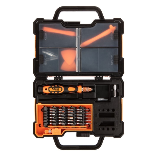 Zestaw do serwisowania smartfonów 44 szt. (nr ref 06-113) uchwyt, pinceta, magnetyzer, demagnetyzer, przejściówka 1/4 na H4, przedłużka, dwie plastikowe szpatułki, 3 otwieraki, szmatka, cztery zamykane boxy, bity: Torx T3,T4,T5,T6,T7,T8,T9,T10,T15,T20; Hex H1.3,H1.5,H2.0,H3.0,H4.0,H5.0; SL 1.5, 2.0, 2.5, 3.0, 3.5, PH 1.0, 1.5, 2.0, 2.5, 3.5, trójkąt 2.0, U U2.6, Y-Y2.0, gwiazdka 1.2