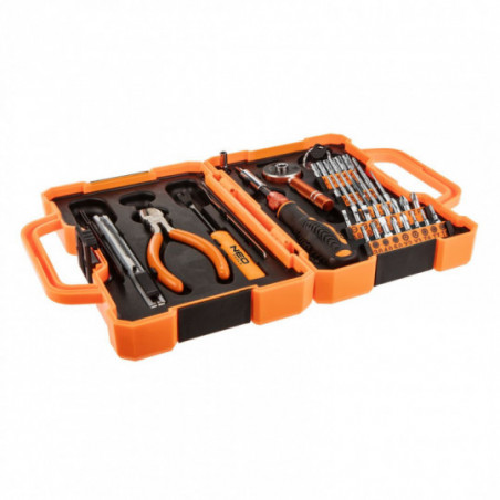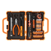 Zestaw do serwisowania smartfonów 47 szt. (nr ref 06-114) uchwyt, grzechotka na bity, precyzyjne szczypce boczne, pinceta, nóż z ostrzem łamanym 9mm, metalowa szpatułka, metalowa "łyżka", przedłużka, przyssawka, plastikowy otwieracz korpusów, pin do simów, przejściówka bitów na bity precyzyjne, nasadki 2.5, 3.0, 3.5, 4.0, 4.5, 5.0, bity SL 3, 4, 5, PH 4, 5, 6, PZ 2, 3, Hex 3, 4, 5, Y 2, 3, Torx 6, 7, 8, bity precyzyjne SL 1, 1.5, 2, PH 1, 1.5, 2, Torx 2, 5, U 2.6, gwiazdka 0.8, 1.2, Y 0.8