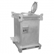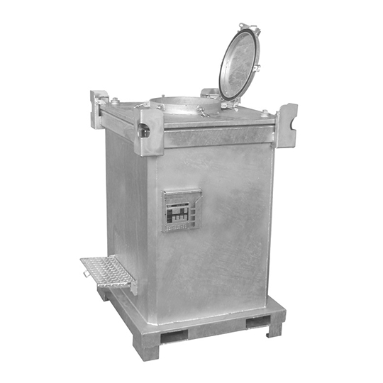 Kontener na odpady niebezpieczne wykonany w zgodzie ze standardem DIN 30741-2. Konstrukcja galwanizowana na ciepło. Niewymagana ochrona. Składane schodki, dodatki: lejek z nierdzewnym sitkiem.