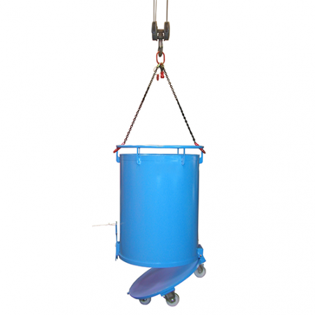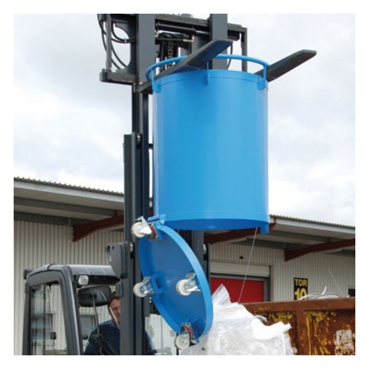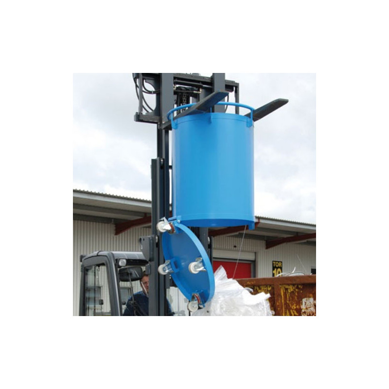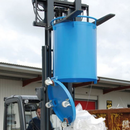 Kontener cylindryczny na odpady typu RB - solidna konstrukcja stalowa dopasowana do wózków widłowych i dźwigów. Zamyka się automatycznie po opróżnieniu, gdy pojemnik jest opuszczany. Klapa zamyka się automatycznie, gdy pojemnik jest ustawiony na ziemi. Zabezpieczany na wózku łańcuchem bezpieczeństwa.