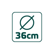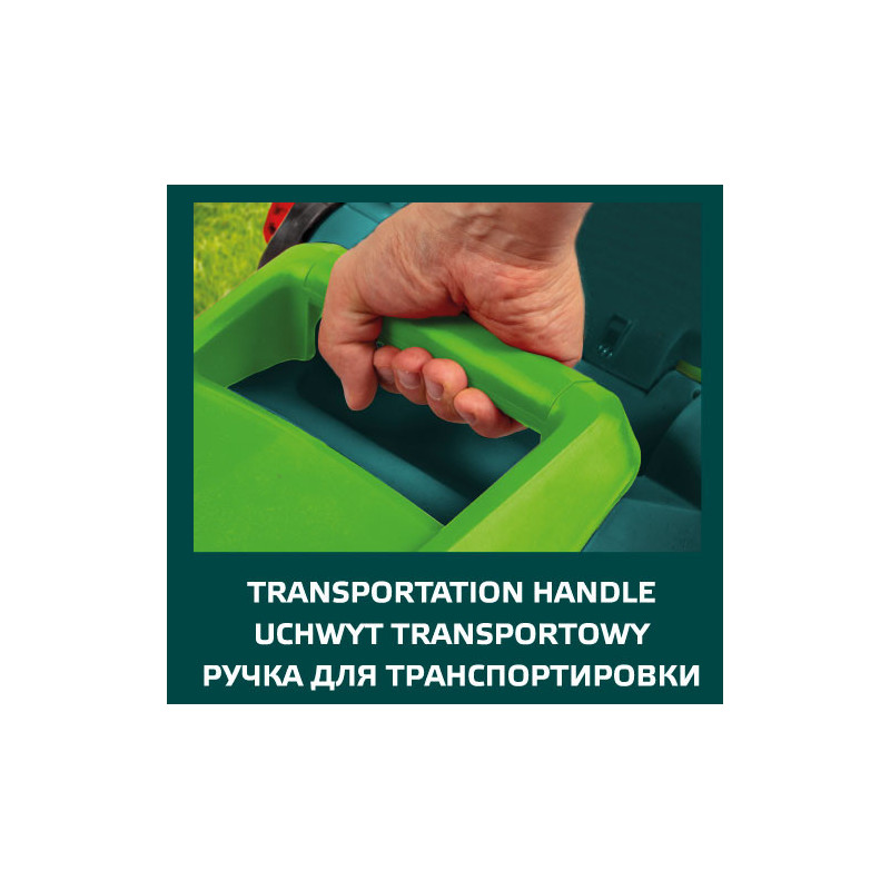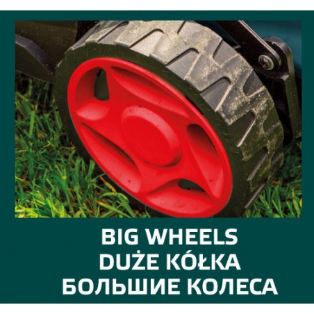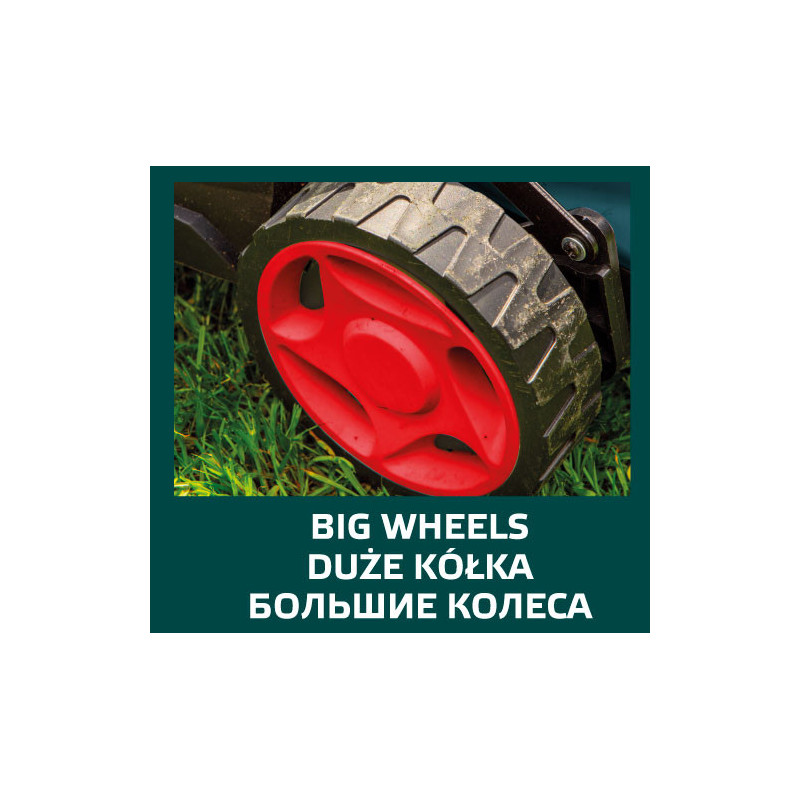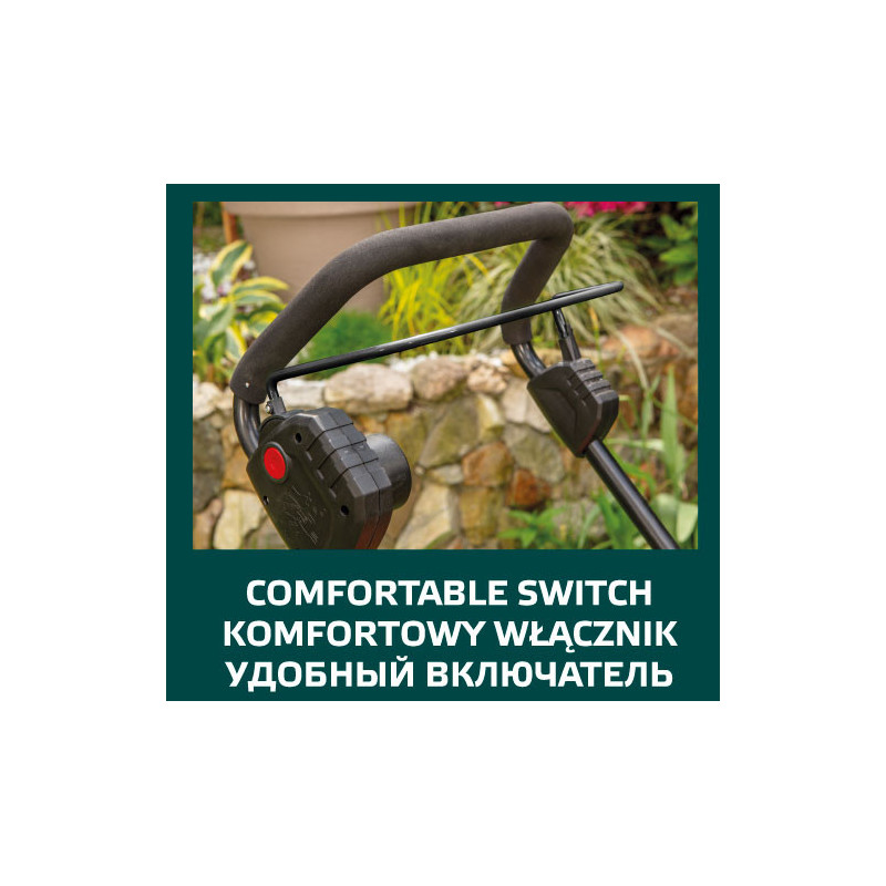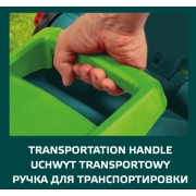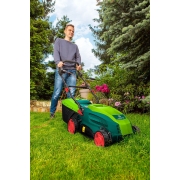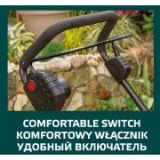 Kosiarka elektryczna 1600W, obroty 3600 min⁻¹, szer. koszenia 360 mm, wys. koszenia 20,30,40,50,60,70 m , masa 13.4 kg