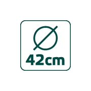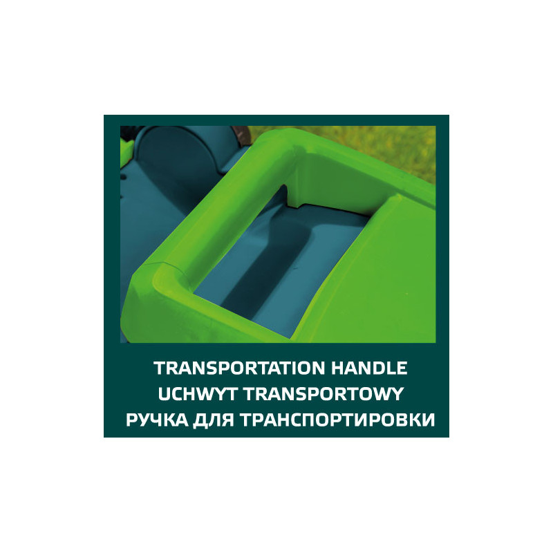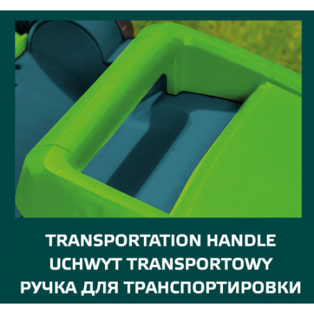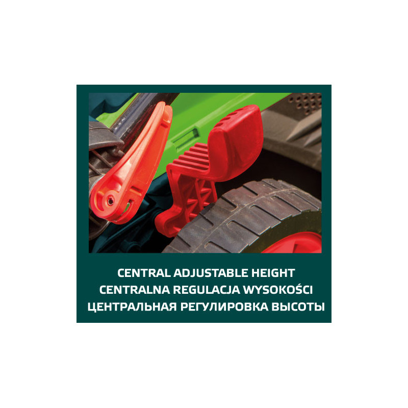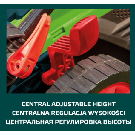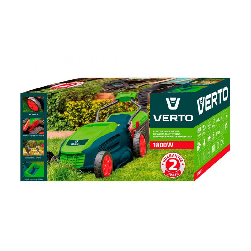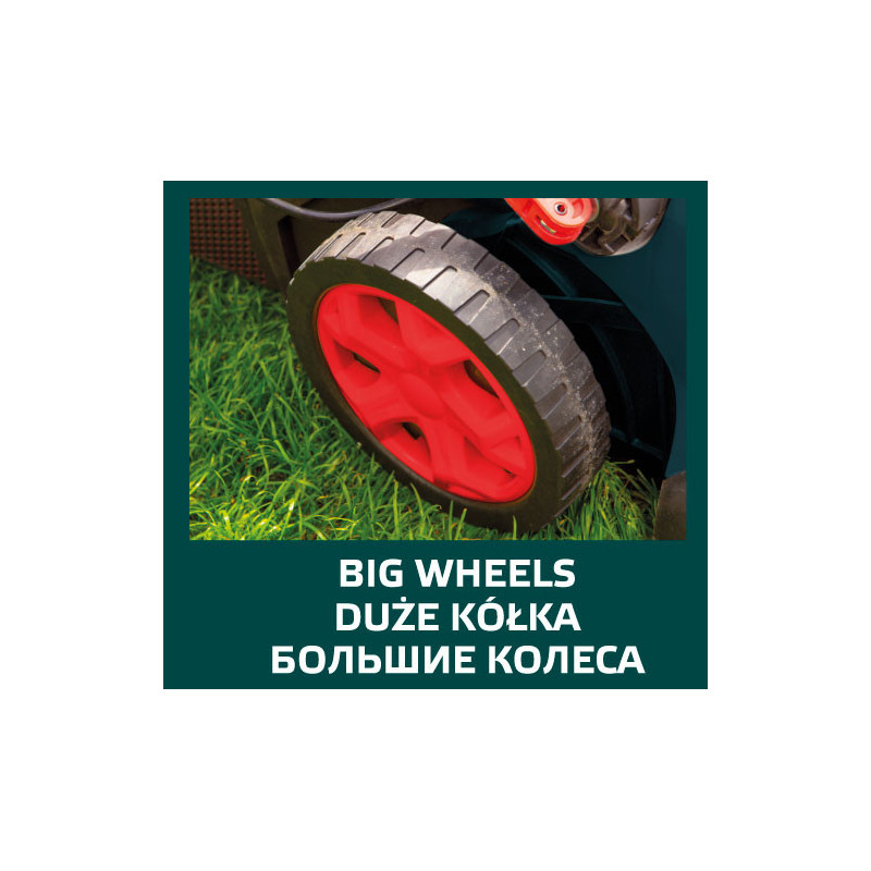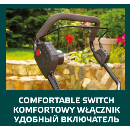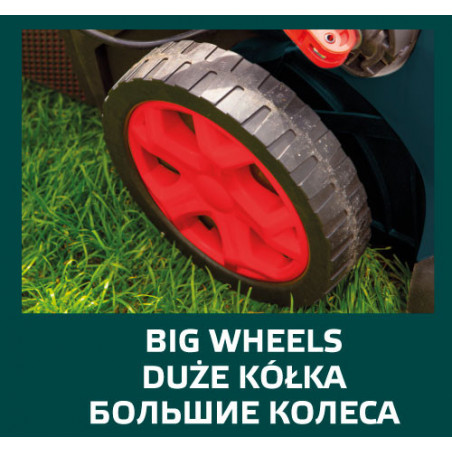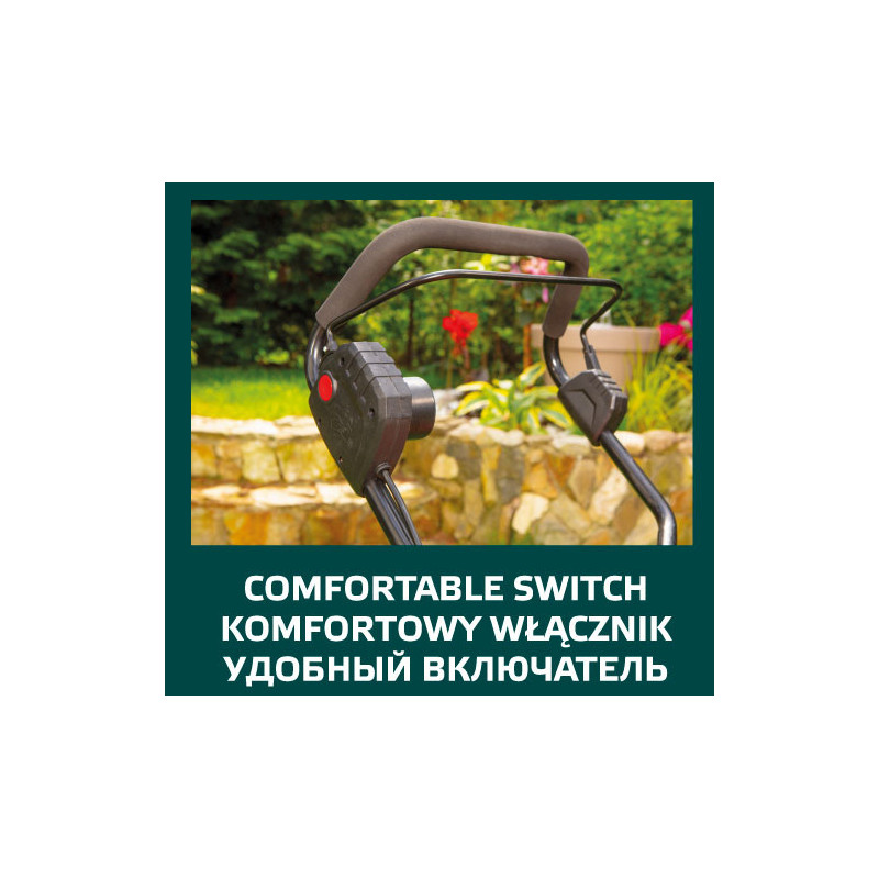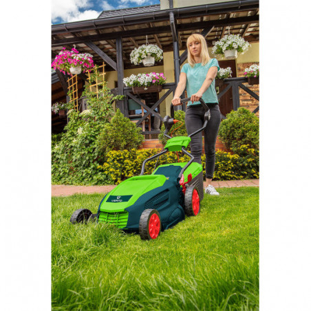Kosiarka elektryczna 1800W, obroty 3600 min⁻¹, szer. koszenia 420 mm, wys. koszenia 20,30,40,50,60,70 m, masa 14.2 kg