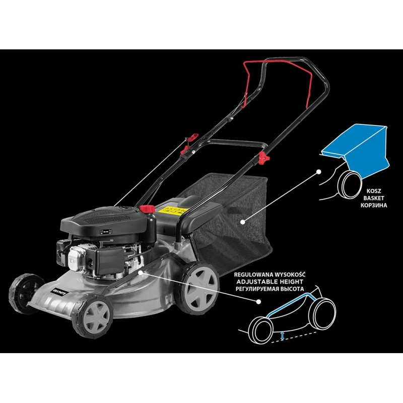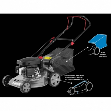Kosiarka spalinowa 1,3KW (1,8KM), pojemność silnika 79 cm3, obroty 3050min⁻¹, szer.koszenia 400 mm, centralna 5-stopniowa regulacja wysokości (25-65 mm), masa 19,5 kg, pojemność kosza 45L, pojemność zbiornika paliwa 1,2L, wyrzut do kosza.