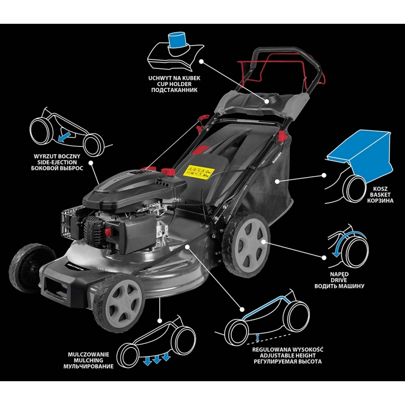 Kosiarka spalinowa z napędem samojezdnym 3,0 KW (4KM), pojemność silnika 173 cm3, obroty 2800min⁻¹, szer.koszenia 502 mm, centralna 5-stopniowa regulacja wysokości (25-65 mm), masa 36 kg, pojemność kosza 55L, pojemność zbiornika paliwa 1,5L, Easy Start (pompka wstępna paliwa), wyrzut do kosza, wyrzut boczny, mulczowanie.