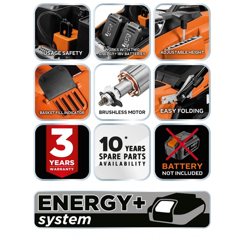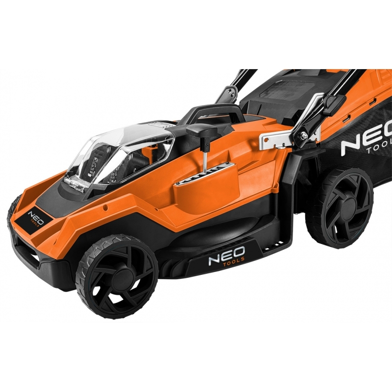 Kosiarka akumulatorowa bezszczotkowa 36V szerokość cięcia 400mm, 6-stopniowa regulacja wysokości koszenia w zakresie: 23 - 75cm; pojemność kosza 40L; prędk. obrot. 2800 obr/min-1
