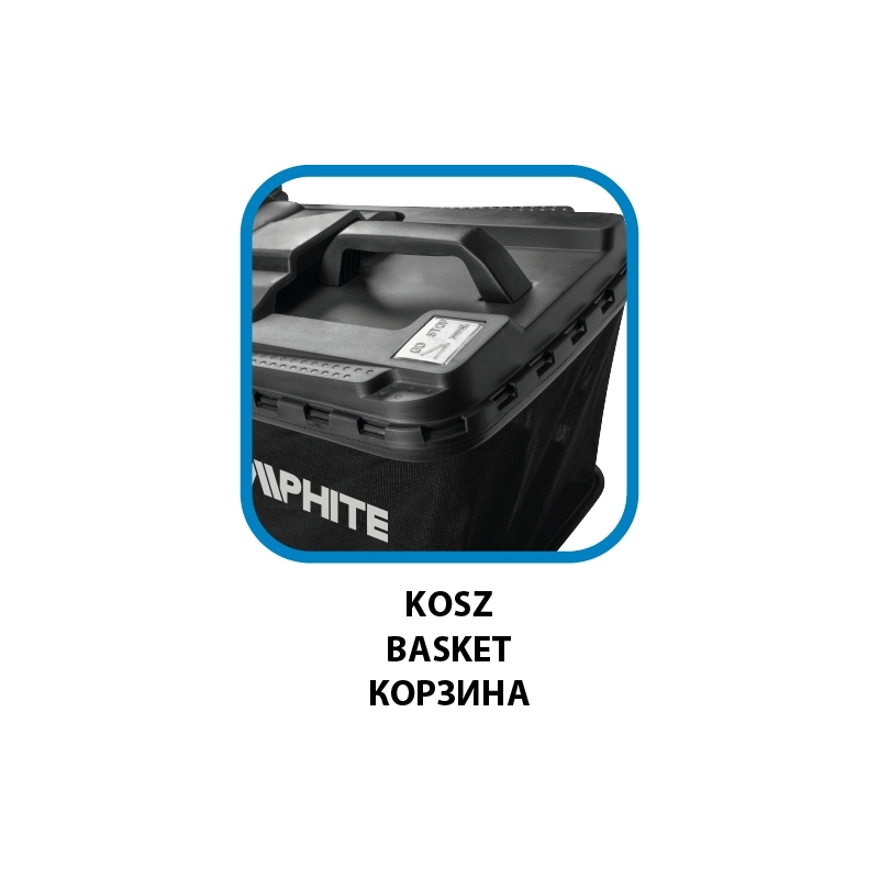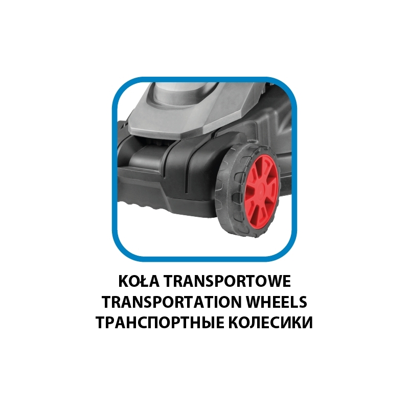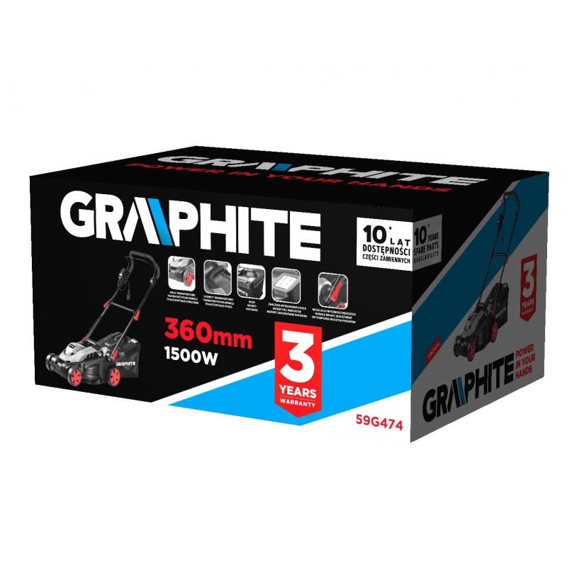 Kosiarka elektryczna 1500W, obroty 3500 min⁻¹, szer. koszenia 360 mm, wys. koszenia 20/35/50 mm , masa 10.1 kg