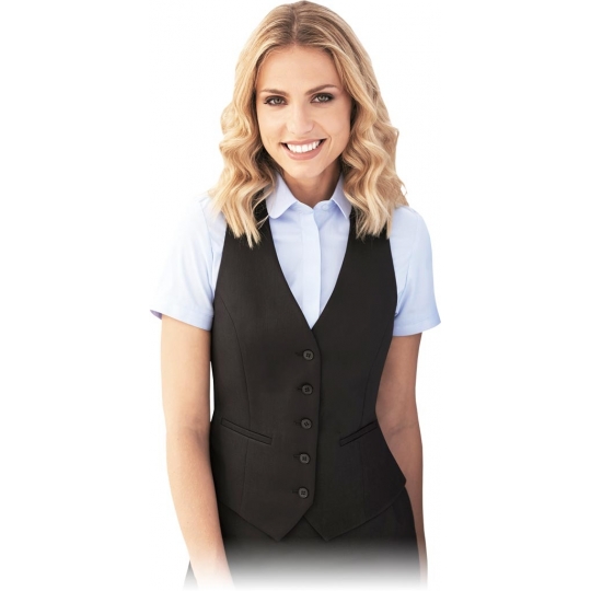 Kamizelka damska, kelnerska. - 100% poliester - gramatura 223 g/m2 - zapinana na guziki - posiada 2 kieszenie boczne - plecy wykończone podszewką - z tyłu ozdobny pasek - możliwość prania w temperaturze do 40°C lub czyszczenia chemicznego